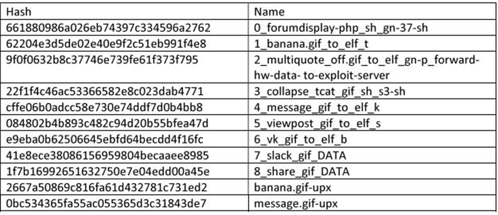 - File names like: banana.gif-to-elf_t, message.gif-upx, viewpost_gif_to_elf_s